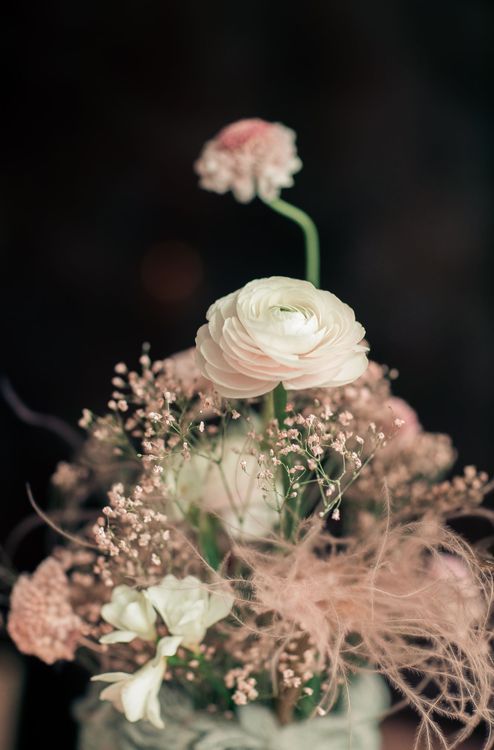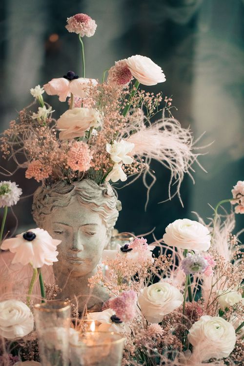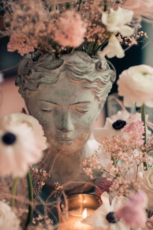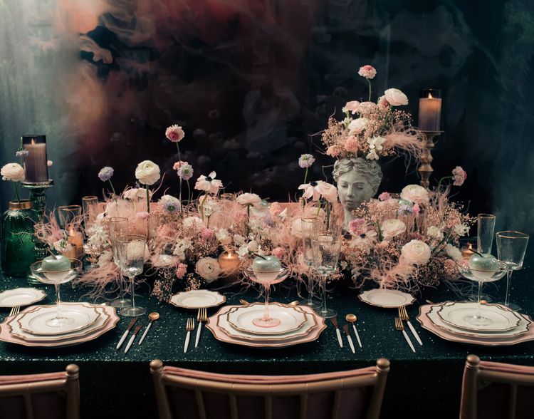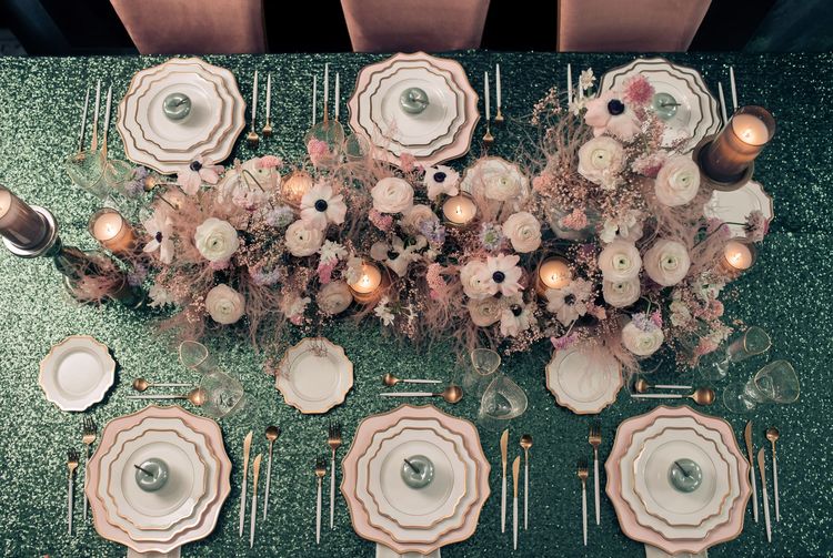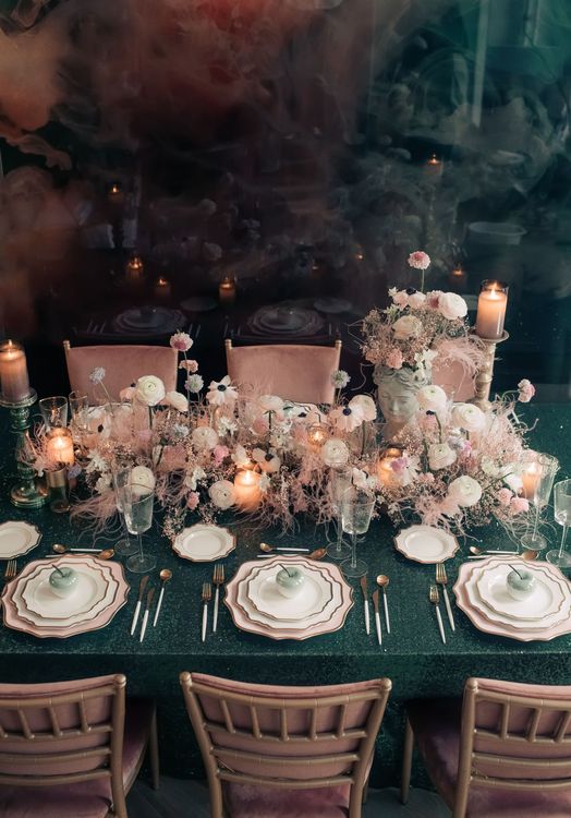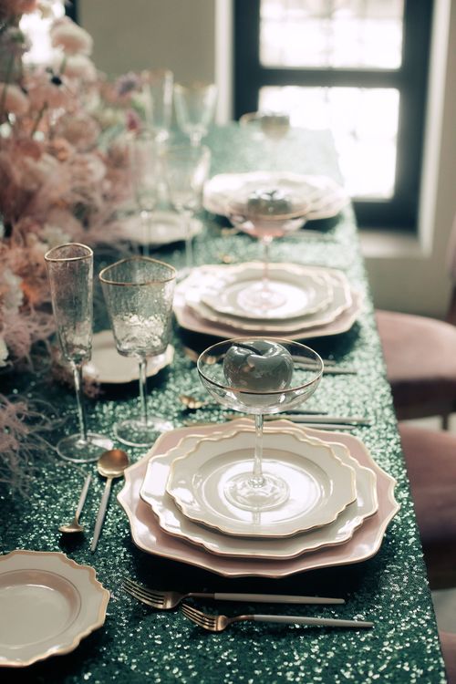 Rectangular table for rent dressed in emerald sequin linen with layered scalloped plates, gold flatware, smoky and blush glassware, candle clusters, and mauve-lilac florals in sculptural bust vases—romantic, moody palette with subtle purple accents; table & chair rental, delivery, setup and pickup available.