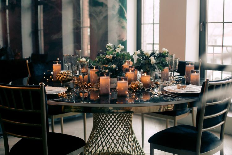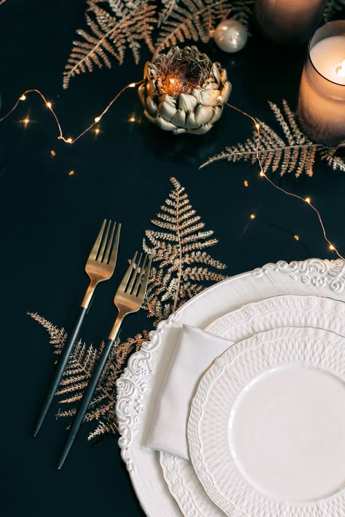Black round table for rent with white embossed plates, gold flatware, smoky glass goblets, candle clusters, and winter greenery with gilded ferns and twinkle lights—moody, elegant holiday dining; table & chair rental, delivery, setup and pickup available.