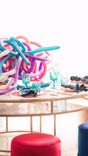 White round CORNELL KIDS table with white plastic shelve and clear glass top