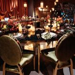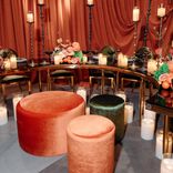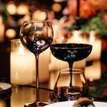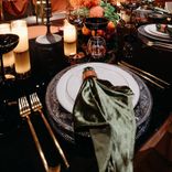 HALFMOON-SHAPED table set in GOLD with black GLASS top