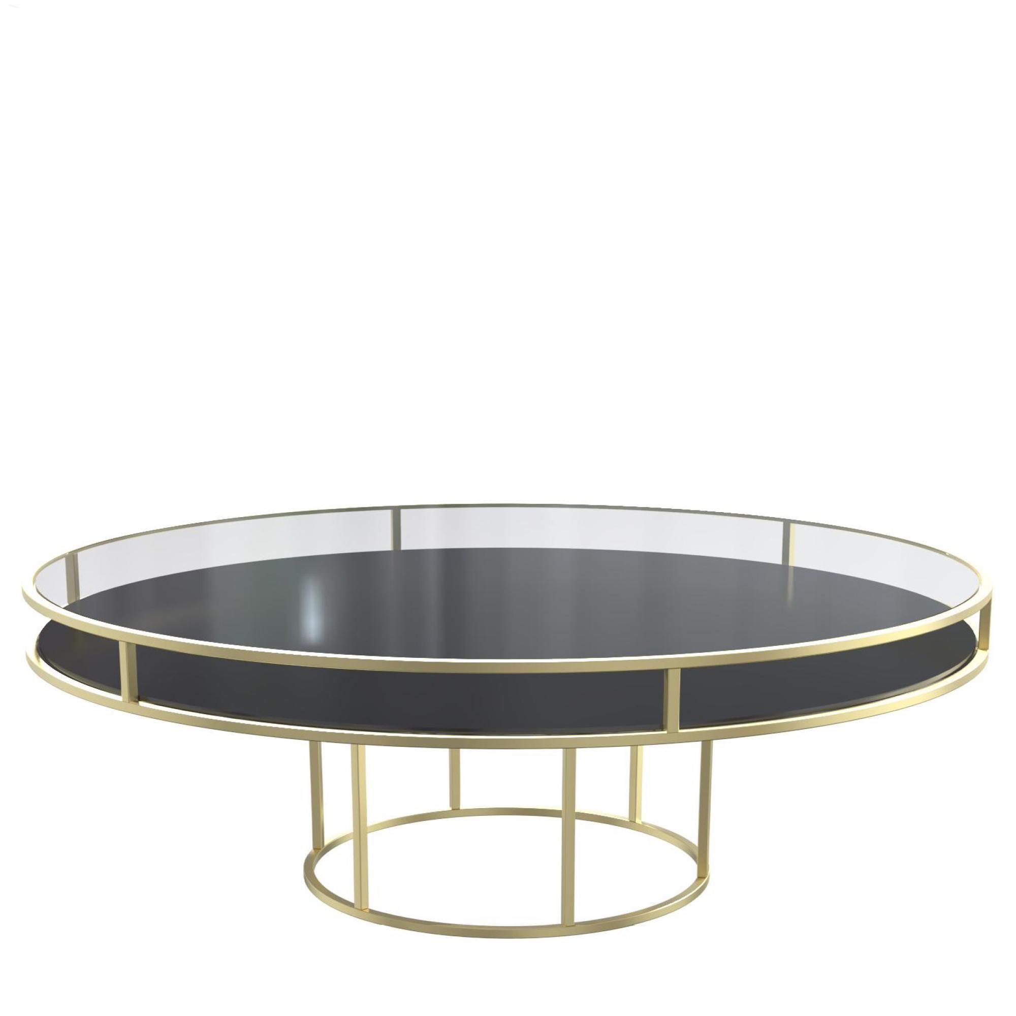 Gold round CORNELL KIDS table with black plastic shelve and clear glass top